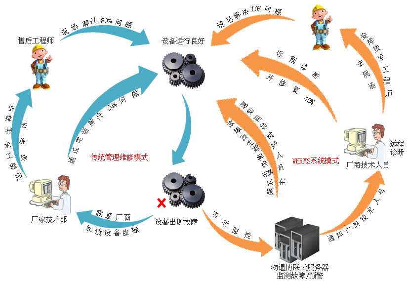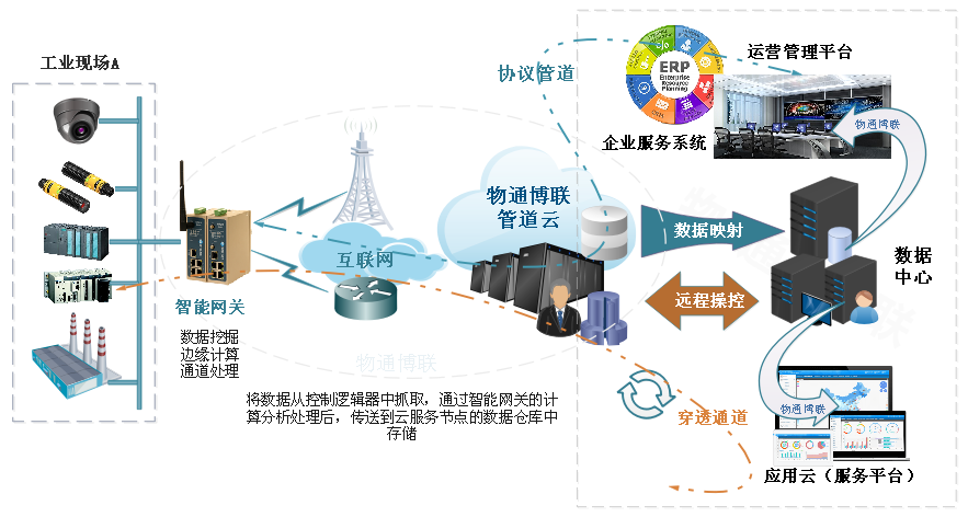 系统以重型工业机械装备远程维护远程运维云平台+智能网关为基础的远程综合管理系统,智能网关是整个系统的数据采集端。它与设备端相连自动采集所控设备的运行状态及相关数据(如地理位置信息,相关的温度、压力、流量等),并通过物通博联穿透云安全管道将信息发送到重型工业机械装备远程维护远程运维云平台;,同时接受重型工业机械装备远程维护远程运维云平台;的指令认证后运行相关操作。