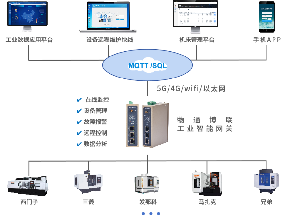 实时采集机床运行数据(机床状态、刀具状态、主轴状态、转速等),生产数据(班次加工数量、班次加工时间、总加工数量、总加工时间等),性能数据(时间稼动率、性能稼动率、OEE、良品率等),并通过5G/4G/WIFI/以太网等方式对接到云平台或上位机中。