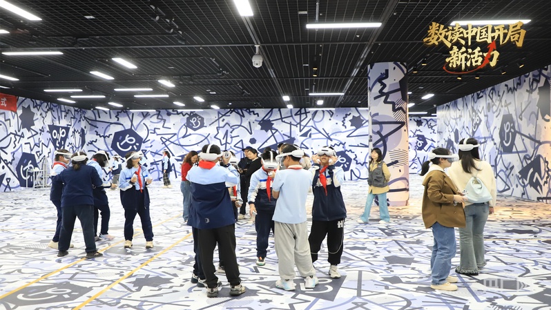 数字化也让历史文化走近大众、焕发新生。在武汉辛亥革命博物院,沉浸式项目《穿越·汉阳兵工厂》成为许多家庭与年轻人的“打卡”新选择。游客戴上VR设备,便可“穿越”至1938年武汉保卫战现场,化身守城士兵,亲历护送设备、阻击敌军等任务。“这种体验非常震撼。”身临其境的体验给中学生叶梓桐留下了深刻的印象。学生们正在体验《穿越·汉阳兵工厂》(央广网记者左洋 摄)