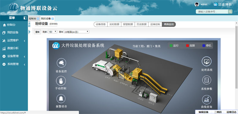 物通博联处理垃圾设备物联网为垃圾处理设备厂家实现全球设备统筹,打造一个安全监控、设备远程维护和管理、设备远程调试、配件管理、故障告警为一体的垃圾处理设备综合服务平台,实现从“生产型制造”向“服务型制造”的转型,提升生产效率、产品质量和技术支持水平。
