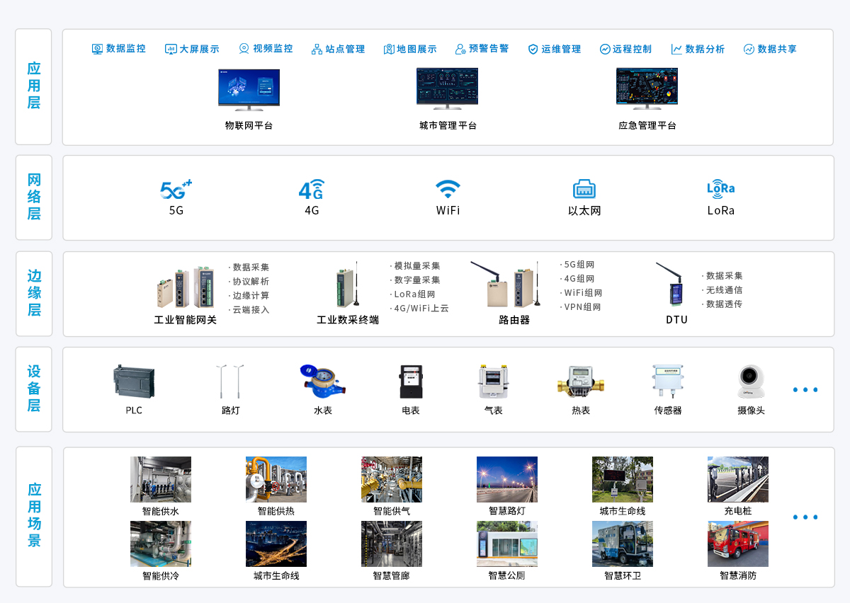 物通博联构建 “感知 - 边缘 - 中台 - 应用” 全栈式智慧城市技术架构:感知层以多品类网关、终端为核心,接入交通、能源、水务、安防等领域设备,采集多源异构数据;边缘层通过本地化计算预处理数据,依托多网络制式构建安全传输通道,向云端高效传数据。中台层以 IOT 数据中台为枢纽,完成数据治理与资产化管理,破解数据孤岛;应用层落地设备监控、能耗分析、民生服务等场景,形成数据驱动的智慧城市运营模式,提升管理效率与民生服务水平。