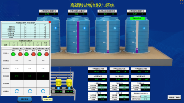 在物通博联·IOT平台中,用户绘制高猛酸盐投加设备的组态界面,通过配置图形、报表、开关等控制并绑定变量数据,并实现手机端电脑端的远程监控和远程控制等操作。