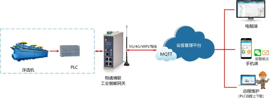 解决方案 通过在浮选车间部署物通博联工业智能网关,接入各个浮选机的PLC系统,实现对PLC数据的快速采集与协议解析,包括设备状态、工艺参数、告警信息等。随后以5G/4G/WIFI/以太网等多种通信方式,可将采集到的数据安全、稳定地传输至选矿厂管理系统中,为后续的数据处理、分析与应用提供可靠的数据来源,促进企业科学决策、高效管理。 实现功能 01 数据采集 网关具备多个串口和网口,能够实时采集浮选机PLC中的各类数据,包括设备状态(运行/停止、故障报警)、工艺参数(矿浆浓度、药剂添加量、充气量、液位、流量)等。