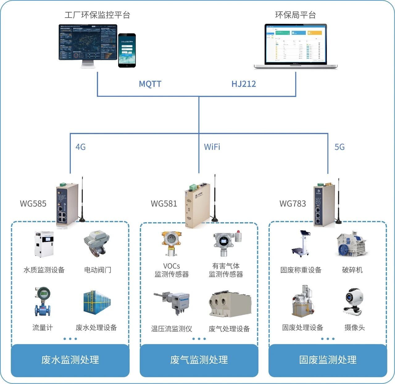 解决方案 通过将废气传感器、水质监测仪、称重仪表等各类环保监测设备接入物通博联的环保数采网关,实现对废气排放(如VOCs、颗粒物、二氧化硫等)、污水排放(如流量、pH值、COD、氨氮等)以及固废排放(如产生量、产生时间等)的实时数据采集。这些数据可通过5G/4G/WIFI/以太网等多种方式,实时上报至工厂环保监管系统、数据库以及环保部门的管理平台,从而全面整合环保数据,实现实时监测、自动告警、报表统计及数据分析等功能,显著提升企业的安全管理水平,筑牢环保合规防线。
